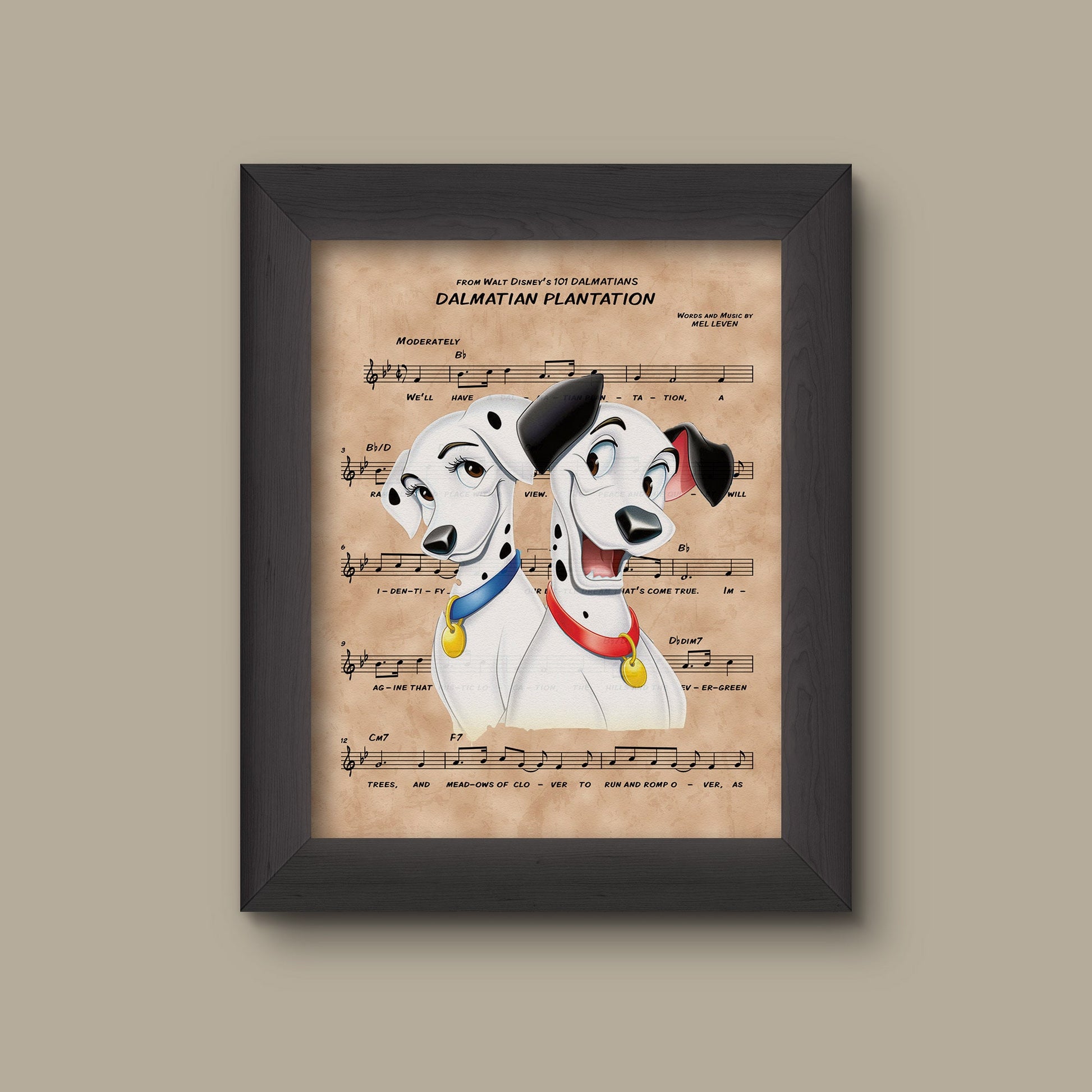 Add a refined touch to your space with this museum-quality art print inspired by 101 Dalmatians Pongo and Perdita over Dalmatian Plantation Sheet Music Art Print.