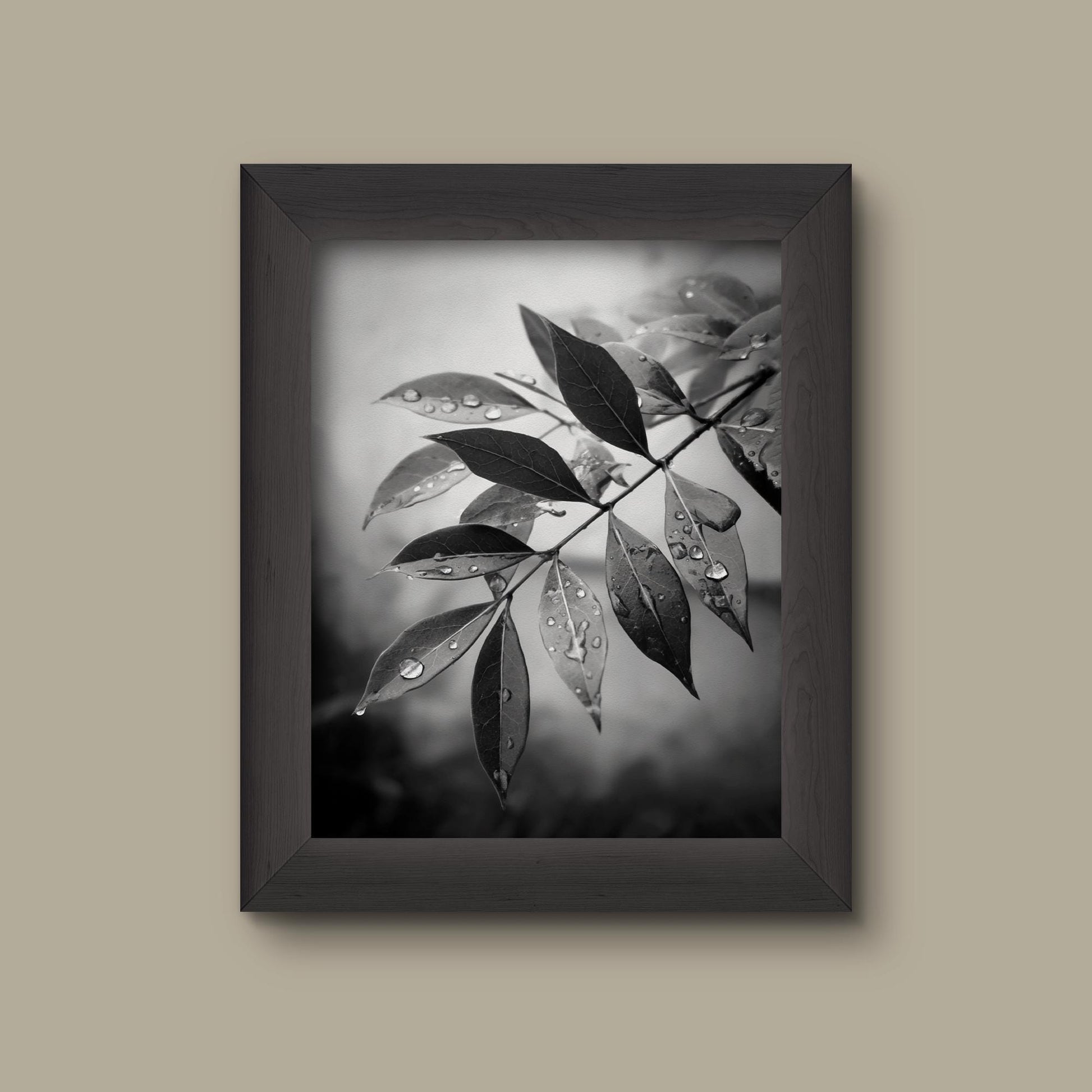 From the artist: Black and White Botanical Art Print This elegant black and white art print captures the delicate beauty of a single botanical branch, adorned with shimmering water droplets. The crisp detail of the elliptical leaves contrasts beautifully against a soft, blurred background, creating a serene and minimalist aesthetic. Perfect for Scandinavian, modern, and nature-inspired interiors, this piece adds a calming, organic touch to any space. ✓ FEATURES: Paper: Archival-quality, ultra-thick fine art...
