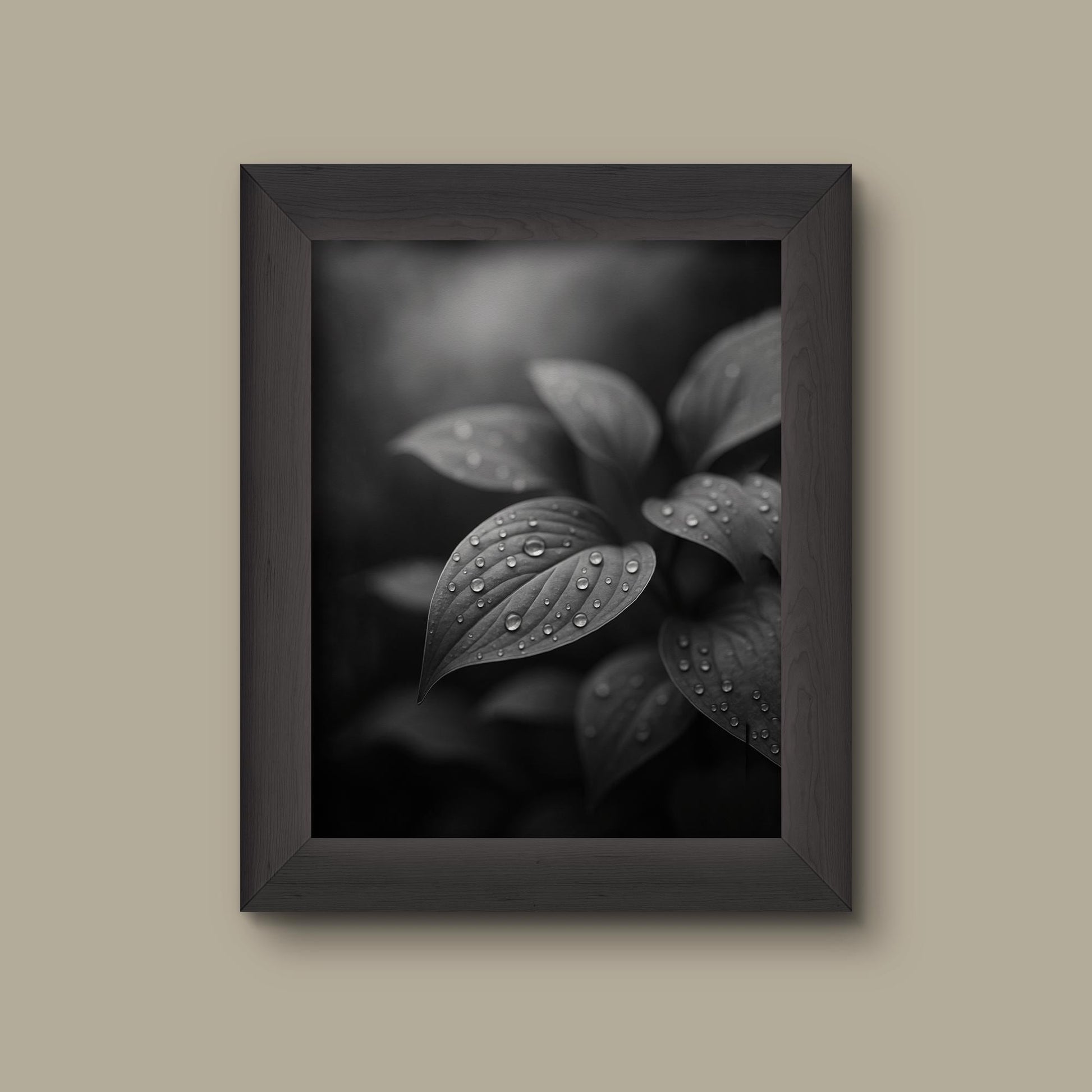 From the artist: Black and White Botanical Leaf Art Print Celebrate the quiet beauty of nature with this stunning black and white botanical art print. Featuring a delicate close-up of a plant stem with smooth, elliptical leaves adorned with shimmering water droplets, this minimalist piece captures serene elegance and natural detail. The soft blurred background enhances the crisp textures and organic lines of the leaves, creating a peaceful and sophisticated look perfect for modern or farmhouse-style interiors....