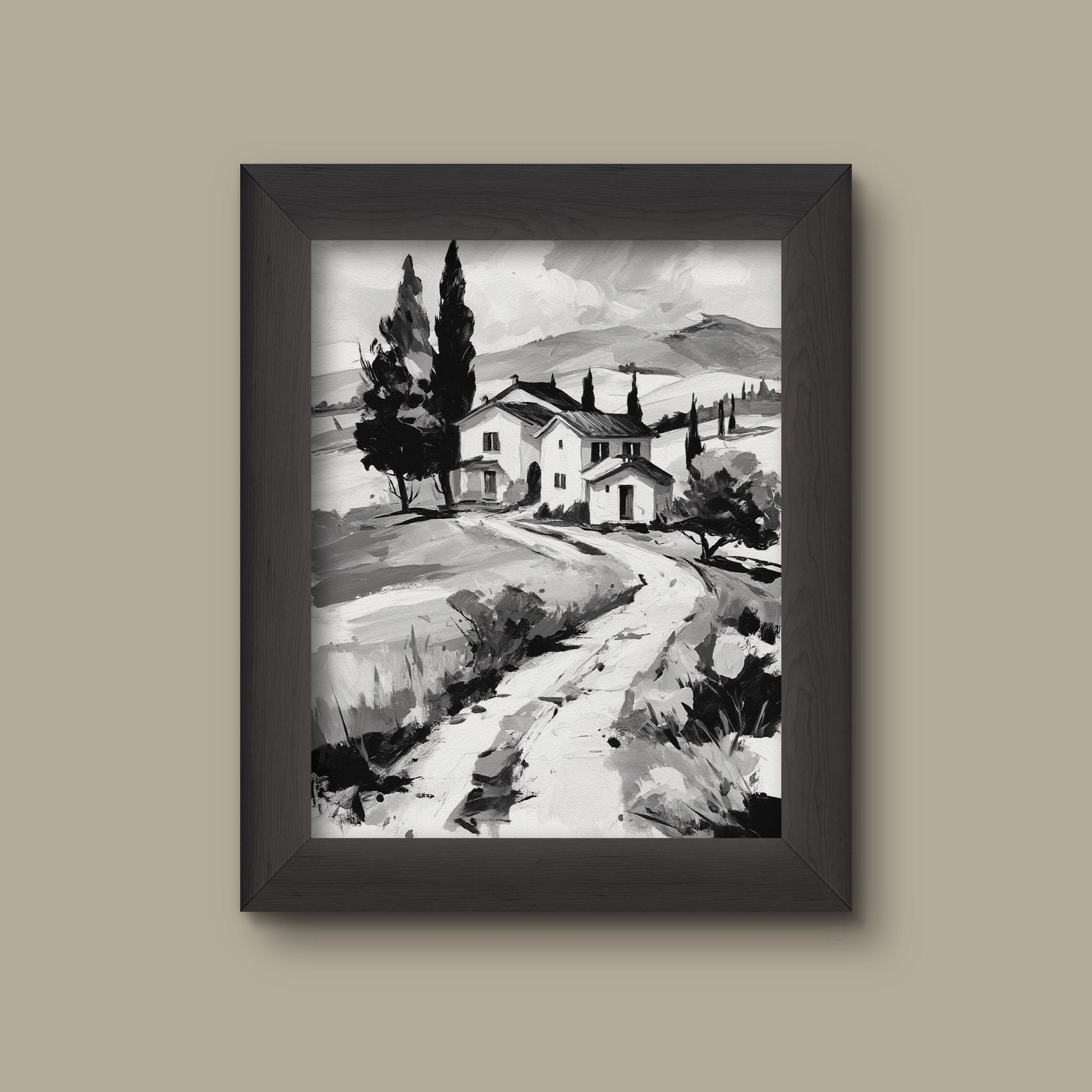 Add a refined touch to your space with this museum-quality art print inspired by Black and White Tuscany Landscape Art Print | Italian Countryside Wall Decor | Minimalist Farmhouse Style.