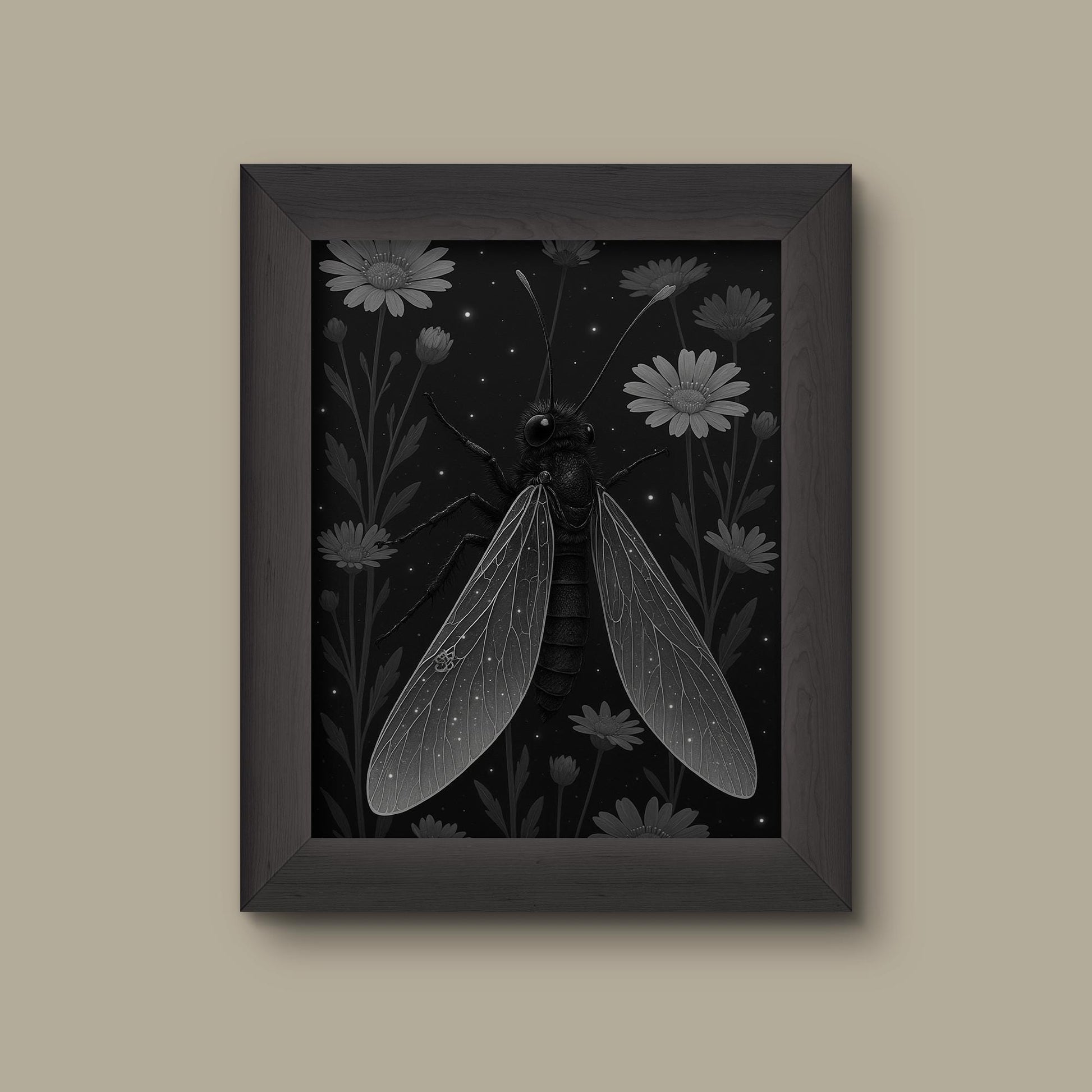 From the artist: Celestial Wasp & Wildflower Art Print – Black and White Insect Wall Decor Discover the beauty of the night through this enchanting Celestial Wasp & Wildflower Art Print. Featuring a highly detailed wasp with luminous, veined wings that glimmer like stardust, this black and white illustration is set against a dreamy night sky filled with softly glowing wildflowers. The piece strikes a perfect balance between nature, fantasy, and fine detail—ideal for those drawn to the quiet magic of the insect...