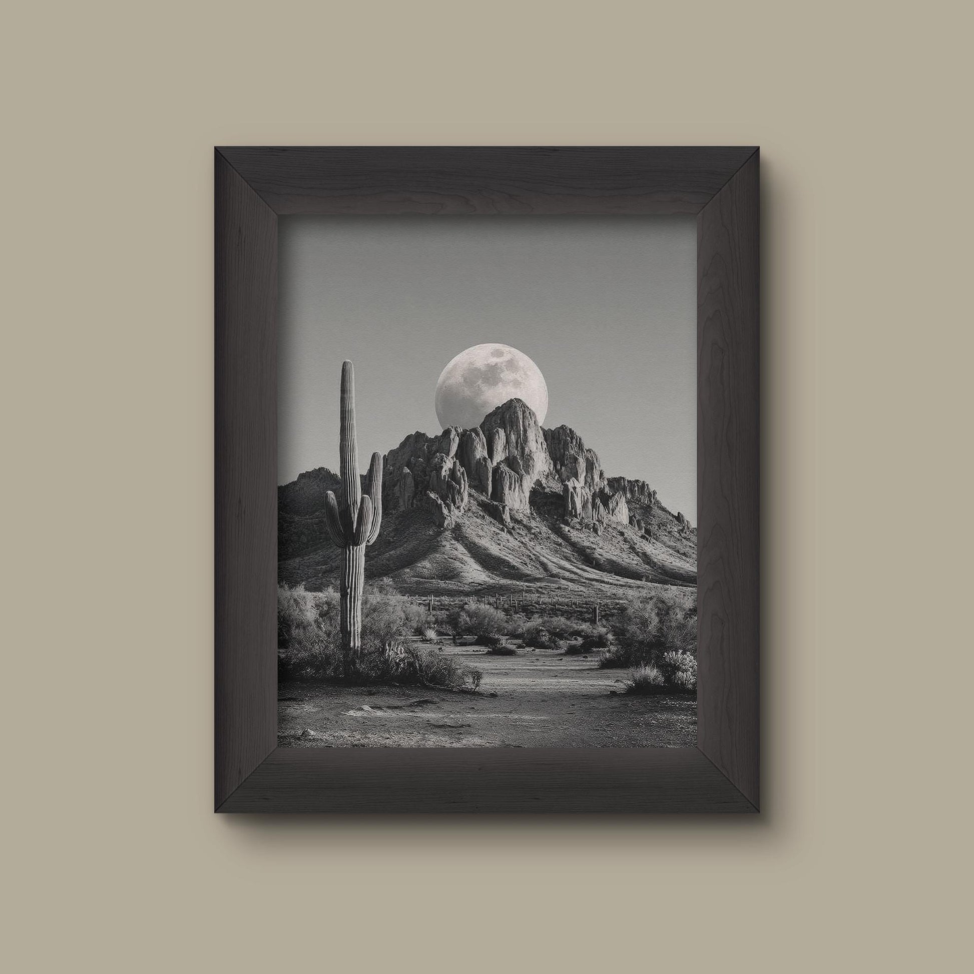 Add a refined touch to your space with this museum-quality art print inspired by Desert Moonrise – Black and White Cactus and Mountain Landscape Art Print.