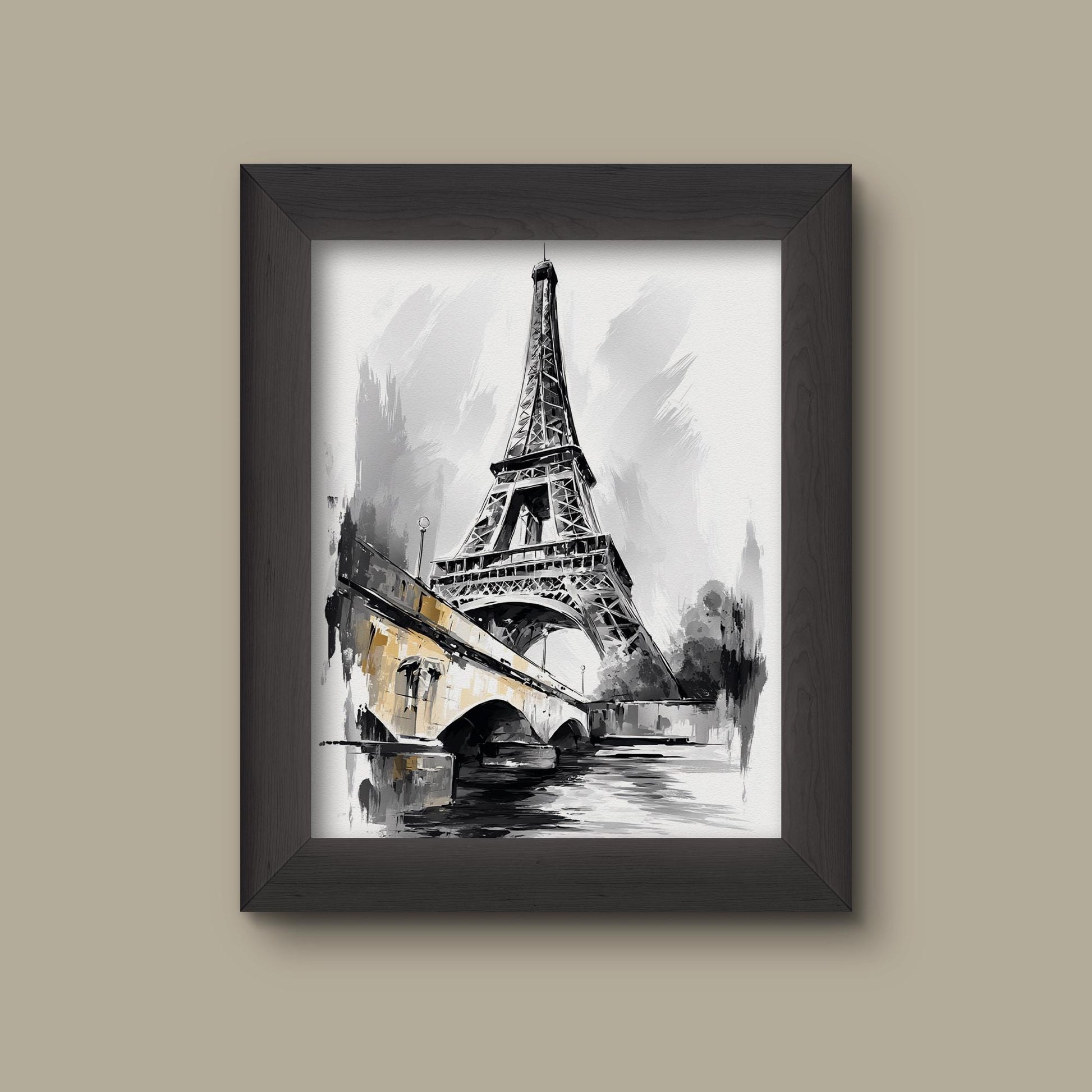 From the artist: Eiffel Tower Art Print | Black and White Paris Landmark Illustration | Modern French Architecture Wall Decor Bring the elegance of Paris into your home with this stunning black and white art print of the iconic Eiffel Tower. This expressive architectural illustration captures the tower from a dramatic upward perspective, set beside the Seine River with subtle golden hues accenting the bridge. The hand-rendered brushstroke style blends timeless sophistication with modern charm—perfect for...