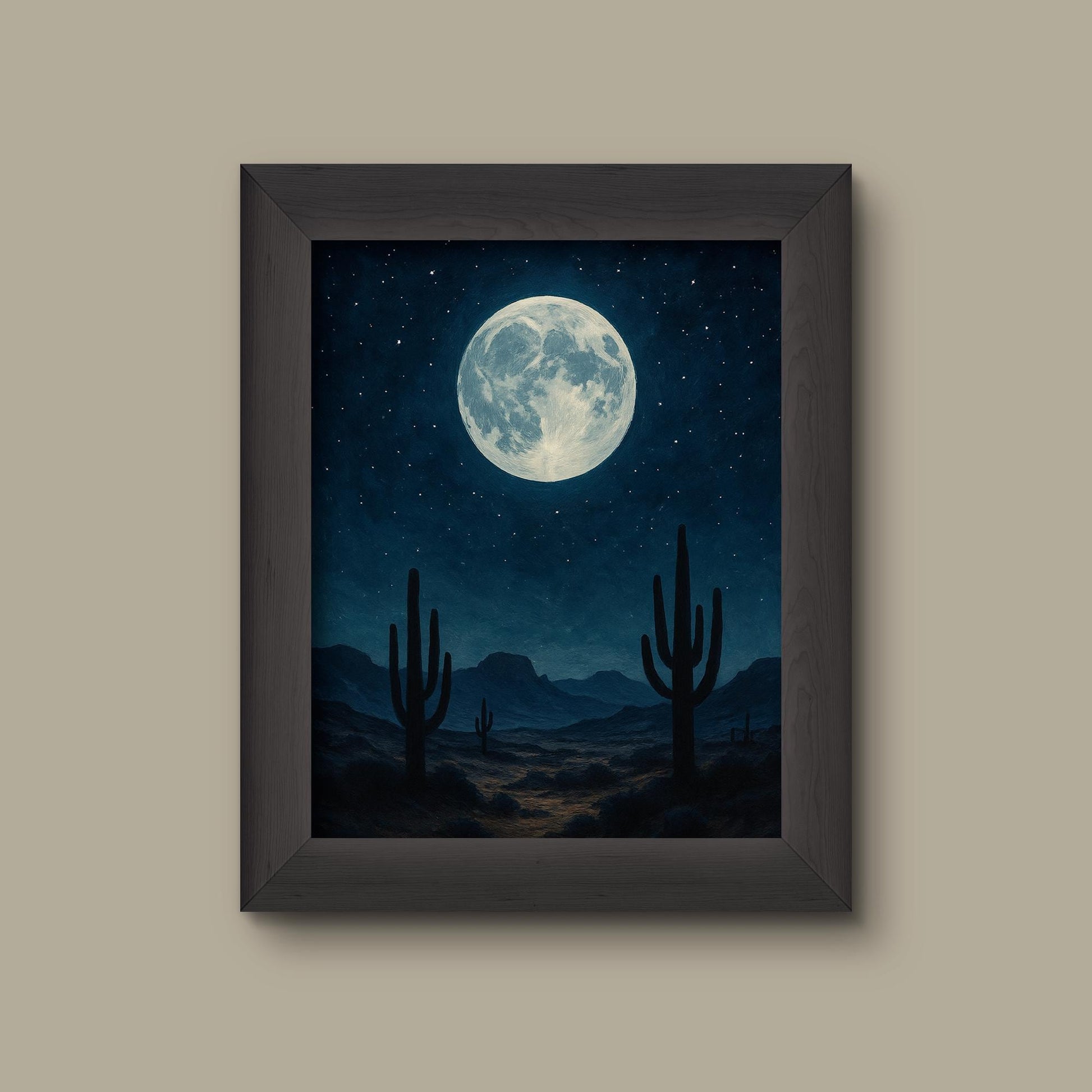 Add a refined touch to your space with this museum-quality art print inspired by Moonlit Desert Night – Southwestern Landscape Art Print with Cactus and Full Moon.