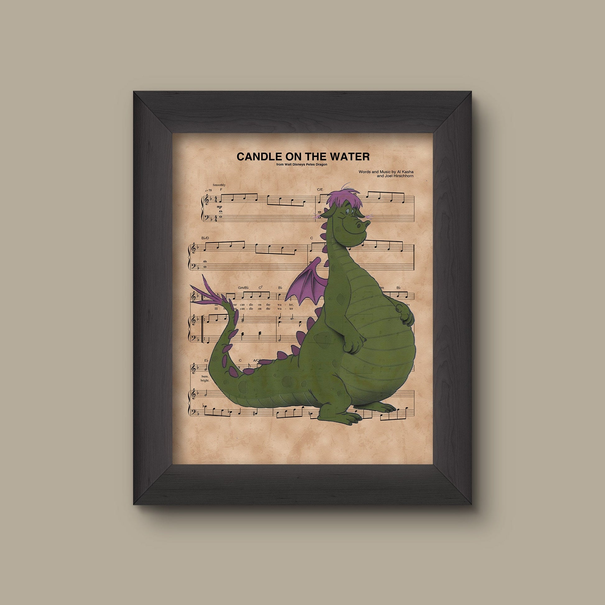 From the artist: Pete's Dragon, Elliott, Candle On The Water Sheet Music Art Print ✓ FEATURES: Paper: Archival-quality, ultra-thick fine art cardstock Quality: The paper is thick, durable, and with a matte finish ( Poster Style) Frames: We currently offer art prints only. Frames in images are for display purposes only. ❤ PROCESS: These prints are designed by us, and handmade one at a time. ✈ SHIPPING: Prints are packaged in a clear sleeve and then shipped in a bend-resistant mailer to protect your items from...