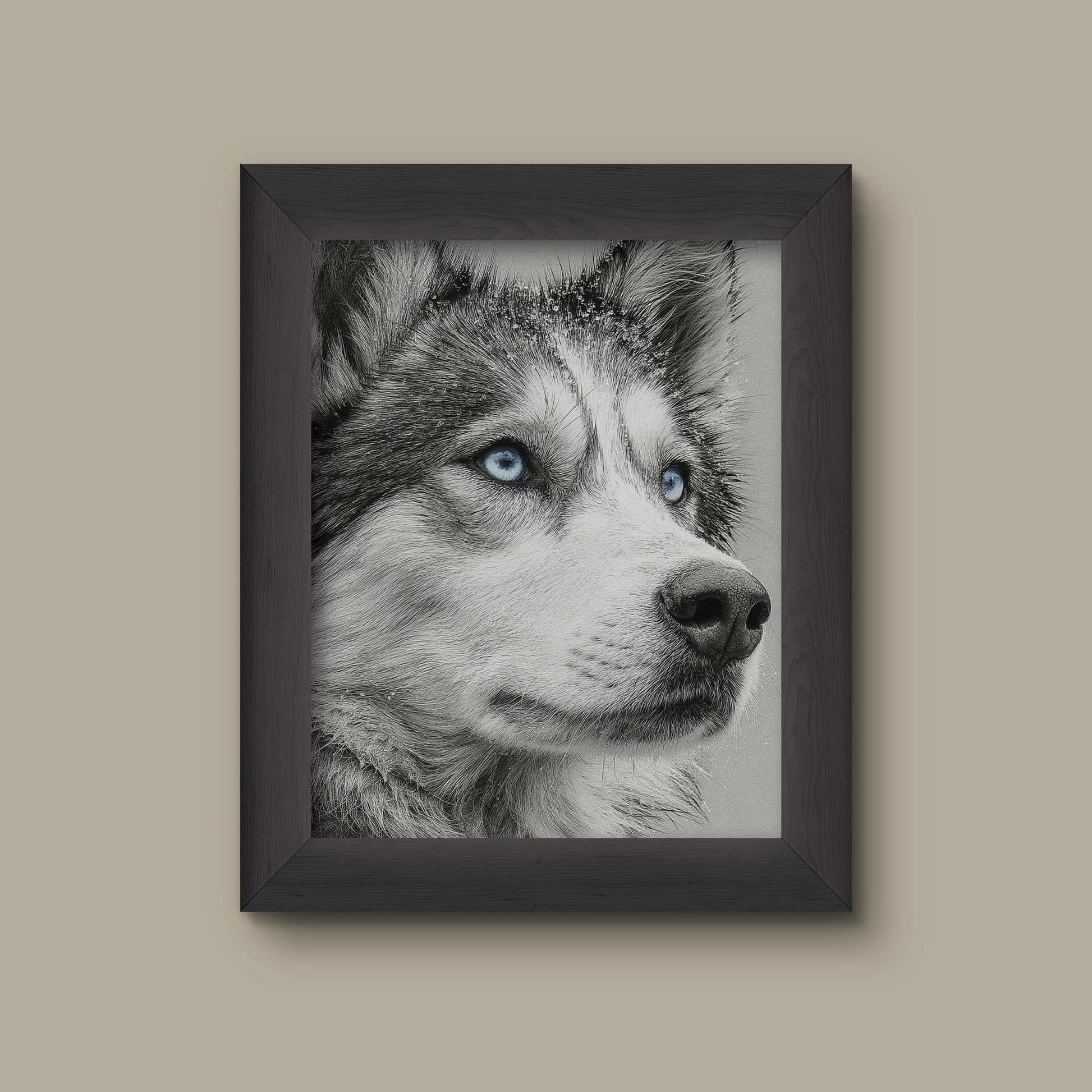 From the artist: Snowy Husky Art Print Bring home the beauty and resilience of the Arctic with this striking art print of a Siberian Husky dusted in snow. The intense blue eyes, frosted fur, and focused expression create a powerful yet serene presence—perfect for rustic winter decor, dog lovers, and Nordic-inspired interiors. Rendered in a photorealistic black and white style with a pop of icy blue, this piece evokes strength, loyalty, and the untamed wilderness. ✓ FEATURES: Paper: Archival-quality, ultra-thick...