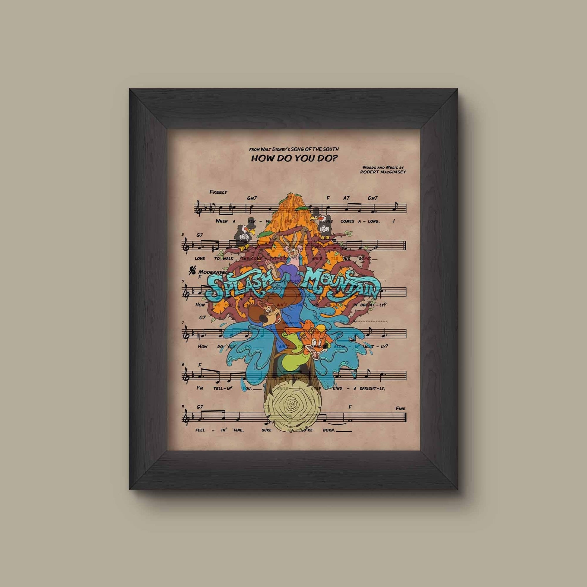 From the artist: Splash Mountain over How Do You Do Sheet Music Art Print ✓ FEATURES: Paper: Archival-quality, ultra-thick fine art cardstock Quality: The paper is thick, durable, and strong and the matte finish of the paper, unlike glossy photo paper, Frames: We currently offer art prints only. Frames in images are for display purposes only. ❤ PROCESS: These prints are designed by us, and handmade one at a time. ✈ SHIPPING: Prints are packaged in a clear sleeve and then shipped in a bend-resistant mailer to...