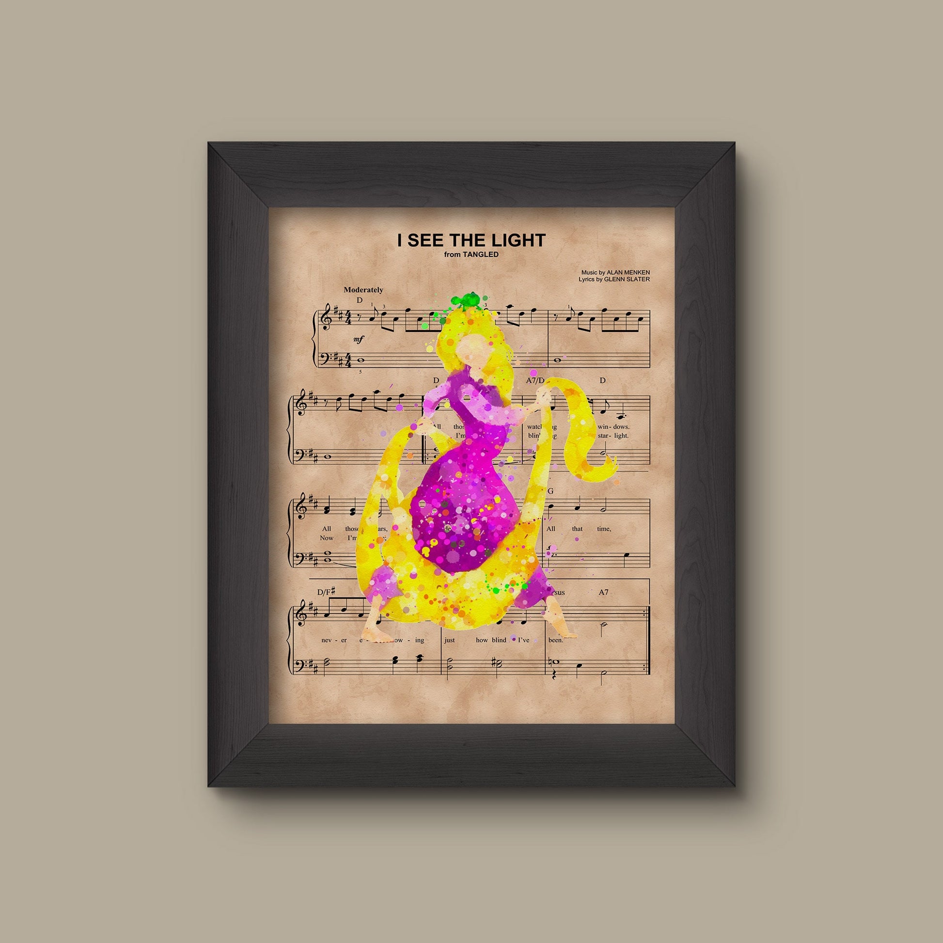 Add a refined touch to your space with this museum-quality art print inspired by Tangled, Rapunzel & Pascal, Watercolor, I See The Light Sheet Music Art Print Disney Nursery Gift, Wall Decor, Sheet Music Art Print.